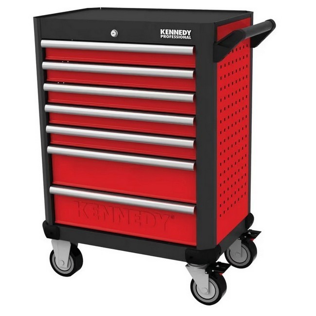 Maximise your potential today with this heavy-duty steel roller cabinet that brings workshop-class storage, mobility and security together in a single robust unit. Designed for professional environments such as workshops, factories and warehouses, the unit features seven fully opening drawers mounted on 45mm ball-bearing slides for smooth, stable operation and a rated 45 kg load per drawer, allowing organised storage of sockets, spanners and power accessories while maintaining reliable performance under frequent use. The cabinet's substantial static load capacity of 550 kg and maximum rolling load of 315 kg means it supports large tool assortments, while a durable powder-coated finish resists rust and solvents to protect the exterior against workshop wear. Ergonomics and safety have been prioritised with an ergonomic side handle for easy repositioning, 125 mm castors with twin quick-lock brakes to absorb shock and stabilise the cabinet when stationary, plastic bumpers and 45° angled corners to reduce impact damage, and a locking mechanism that secures all drawers together; an integrated safety feature limits drawer opening so only one wide drawer can open at a time to prevent tipping. Internal protection is provided by a non-slip 10 mm EVA top mat and 3 mm drawer liners that prevent tool movement and surface abrasion during transit. Perforated side panels permit accessory installation to customise storage layouts, while the unit can be combined with additional top chests for scalable capacity. Compactly proportioned for practical placement yet generous in capacity, the cabinet measures 844 mm high by 706 mm long and 461 mm deep, and balances a substantial 67.4 kg build weight with manoeuvrability. Available in eye-catching red and grey, the finish promotes visibility across busy floors while the perforated sides allow hang-on storage modules and tool holders to be fitted for rapid access, making this cabinet especially suited to mechanics, maintenance teams and production lines where time and space economies are critical. This roller cabinet is an investment in productivity, reducing time spent searching for tools, improving ergonomics and enhancing workplace organisation so teams can work faster, safer and more efficiently.