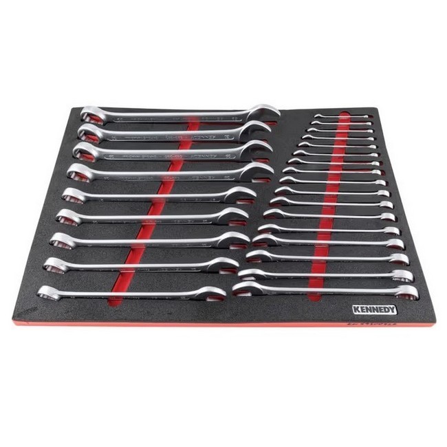 Designed with you in mind, this 26-piece metric combination spanner set delivers a comprehensive, workshop-ready solution that combines durability, organisation and rapid tool retrieval for professional and DIY environments alike. The set spans the most commonly required sizes from 6mm through to 32mm, offering 6, 7, 8, 9, 10, 11, 12, 13, 14, 15, 16, 17, 18, 19, 20, 21, 22, 23, 24, 25, 26, 27, 28, 29, 30 and 32mm to ensure you always have the right spanner on hand for vehicle maintenance, aircraft servicing, mechanical workshops or general industrial tasks. Each spanner is forged from chrome vanadium steel for high tensile strength and resistance to wear, while a protective finish helps guard against corrosion and prolong working life in demanding environments. The set is presented in a full-width foam tool control inlay specifically sized for tool roller cabinets, with a 56 x 39 cm foam footprint that secures each tool in its designated location to prevent movement and impact damage during transport or storage. A red foam underlay improves visual detection of missing items, and strategically positioned finger cut-outs allow quick, one-handed removal and replacement of tools to speed workflow and reduce downtime. The compact yet robust case body incorporates practical storage design, protecting tools from debris and minimising the risk of misplaced implements, which in turn reduces unnecessary expenditure on replacements or external labour for minor repairs. Ergonomic considerations extend to the spanner profiles, which are shaped to provide positive contact with fasteners and minimise rounding, improving safety and efficiency during repeated use. Overall, this set supports a methodical approach to maintenance and repair, encouraging preventative upkeep and enabling technicians of varying skill levels to work with confidence, maintain productivity and safeguard assets through reliable, easily accessible tooling.