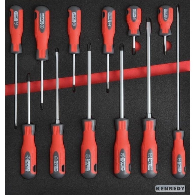 Original design combines a 12-piece screwdriver set with a 2/3-width foam inlay tailored for tool roller cabinets, delivering a professional solution for workshops, warehouses and factories. The set features industrial-grade chrome vanadium steel blades with magnetic tips to retain fasteners and speed repetitive work, paired with a unique dual-grip triangular handle that improves comfort and enables higher torque with reduced user fatigue, conforming to DIN ISO2380/8764 standards. The foam inlay measures 38.5 by 37 centimetres and is finished with a vivid red underlay beneath a durable top layer, giving instant visual recognition of any missing tool while resisting industrial wear; finger cut-outs further simplify retrieval and return, eliminating the need to search through crowded drawers and reducing handling time. Included are a comprehensive range of slotted and cross-head drivers to meet common maintenance needs, from stubby drivers for confined spaces to long shank variants for deeper access, ensuring that furniture assembly, machinery adjustments and electrical panel work can be completed efficiently. The kit is thoughtfully specified to cover the most frequent field requirements, with stubby and standard slotted drivers, longer shafts up to 250 millimetres for reach into deep assemblies, 5.0 and 6.3 millimetre slotted options, an 8.0 millimetre driver for heavier fasteners and Pozidriv variants to handle crosshead fittings; this breadth reduces the need to carry additional loose tools. The foam is configured as a 2/3-width module specifically sized for tool roller cabinets, supporting structured tool control, stock audits and rapid replenishment. Systematic storage prevents tools sliding during transit, protects expensive kit from damage and deters loss or theft by making discrepancies immediately obvious, thereby enhancing workplace safety and reducing the likelihood of tools being inadvertently left inside vehicles or machinery. For engineering teams and maintenance staff the combination of ergonomic design, magnetic tips and controlled storage promotes consistent, high-quality workmanship, reduces downtime associated with misplaced tools and supports planned preventive maintenance regimes while improving technician productivity and protecting valuable assets.